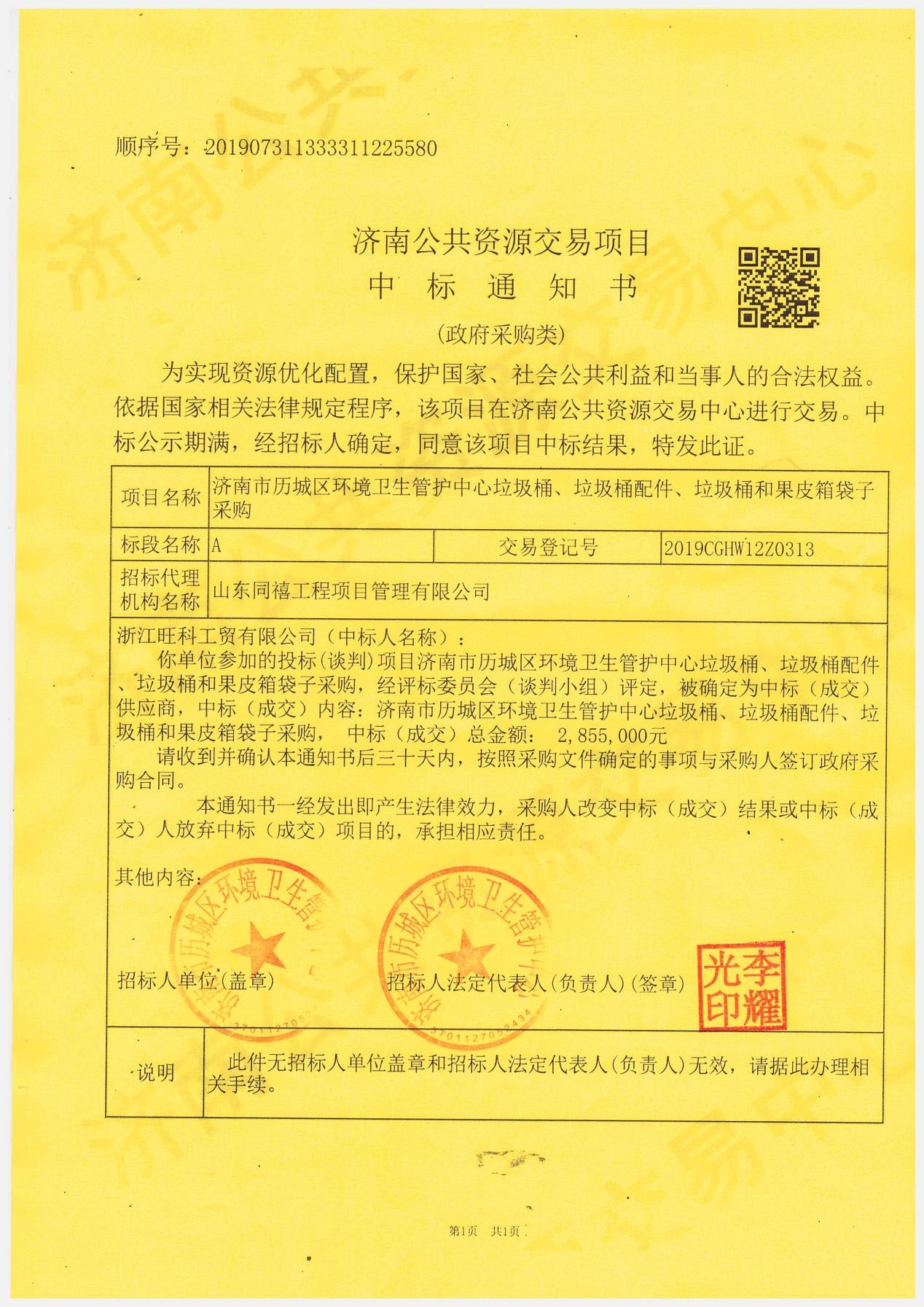 濟南公共資源交易項目 中標通知書